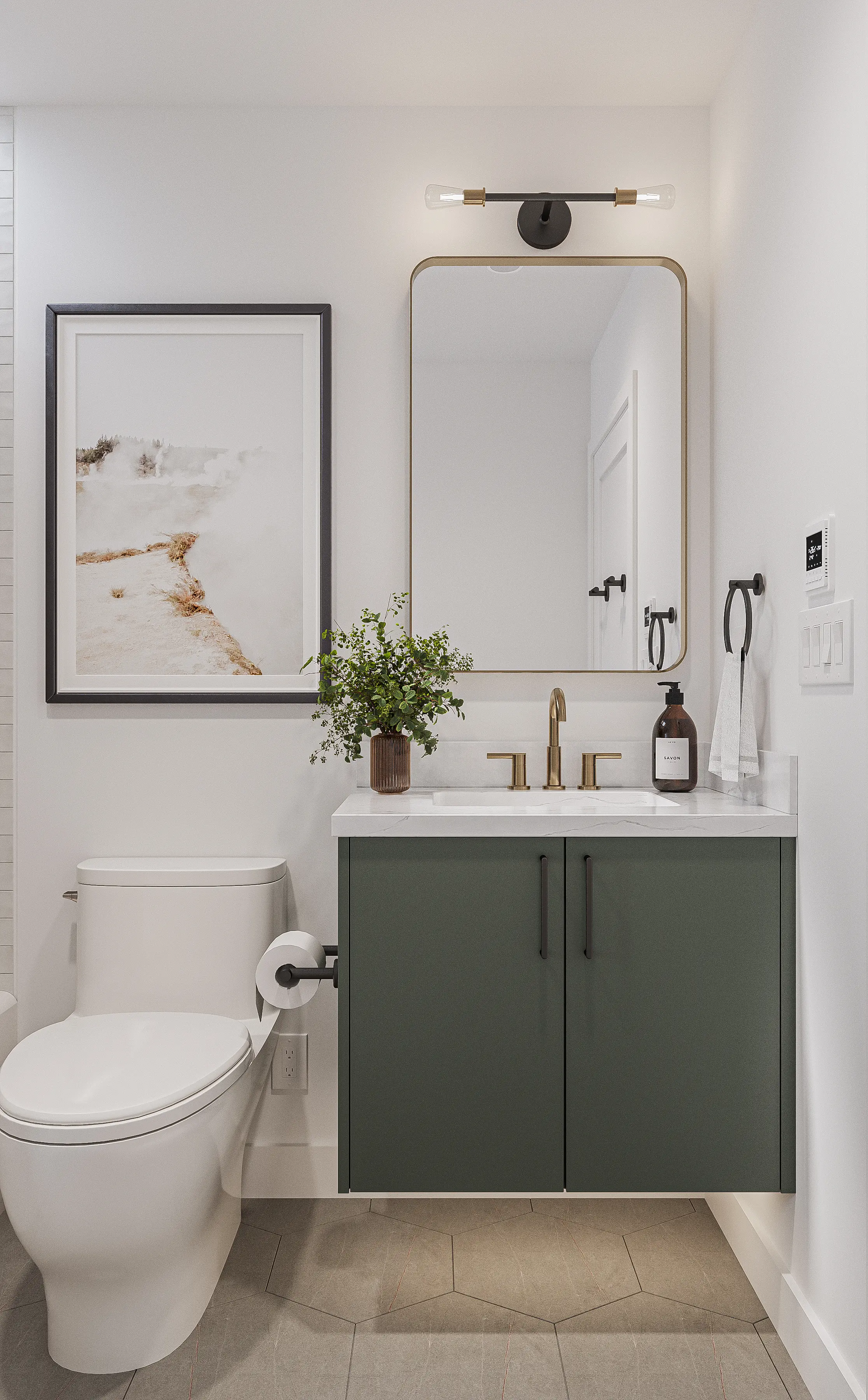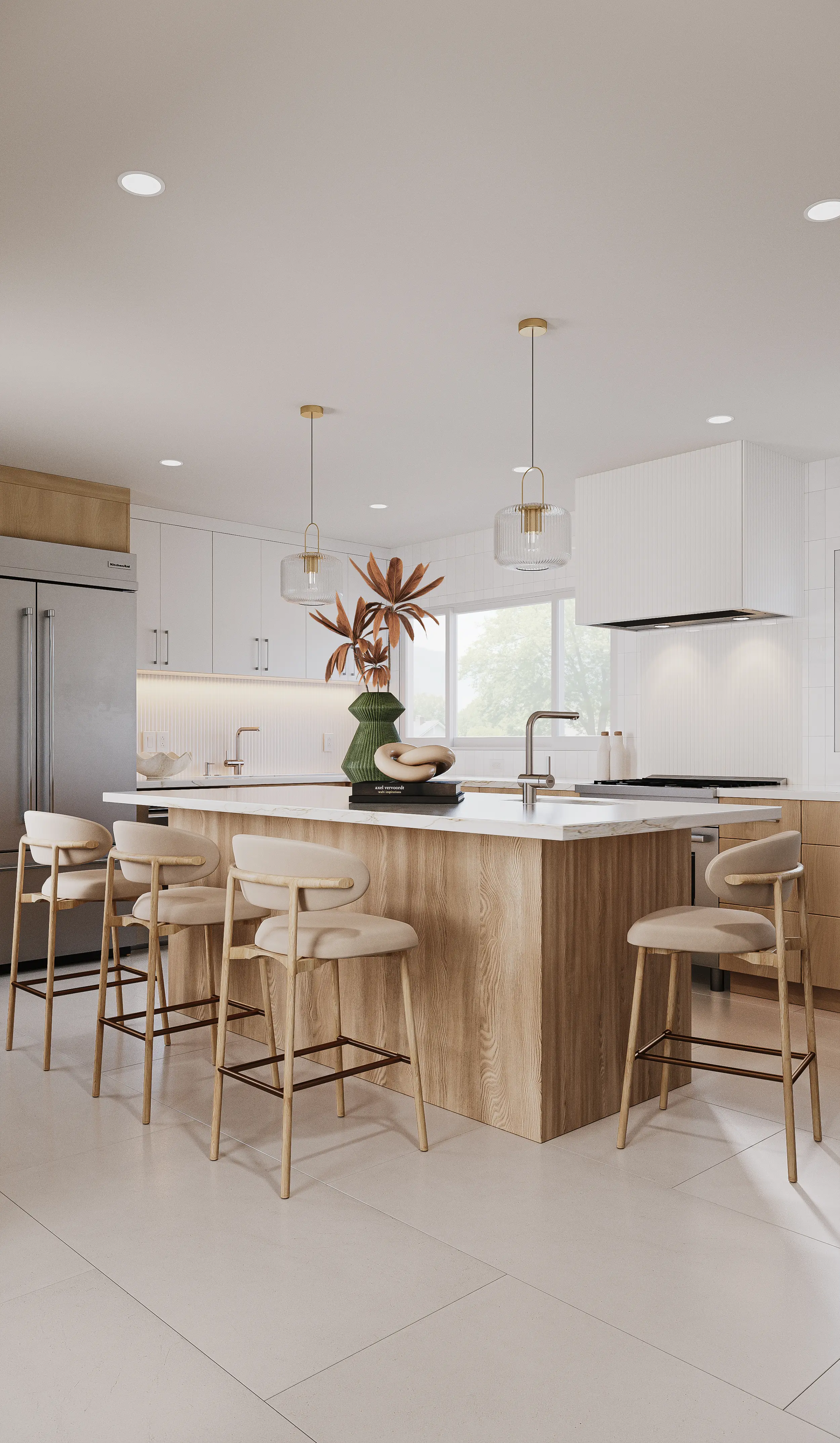 The kitchen anchors the space with a warm wood island, crisp white cabinetry, and refined brass accents, creating a modern yet inviting atmosphere. Bathrooms and supporting spaces continue the language with simple forms, gentle contrasts, and thoughtfully selected materials that elevate everyday living.